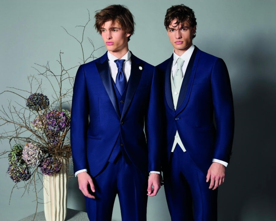 Abito a sinistra: Questo modello presenta una giacca monopetto con un bottone e un elegante rever a lancia in raso lucido blu. Il gilet è dello stesso tessuto e colore della giacca, completato da un cravattone abbinato.